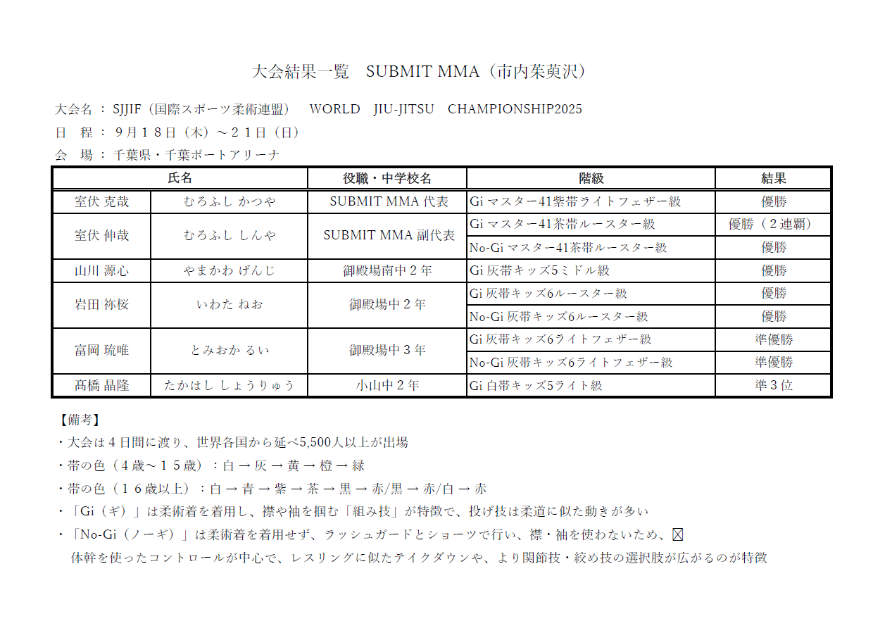 9月に千葉県で開催された「SJJIF(国際スポーツ柔術連盟) WORLD JIU-JITSU CHAMPIONSHIP2025」にて、大変優秀な成績を収めたSUBMIT MMAの皆さんが市長を表敬訪問しました🥋