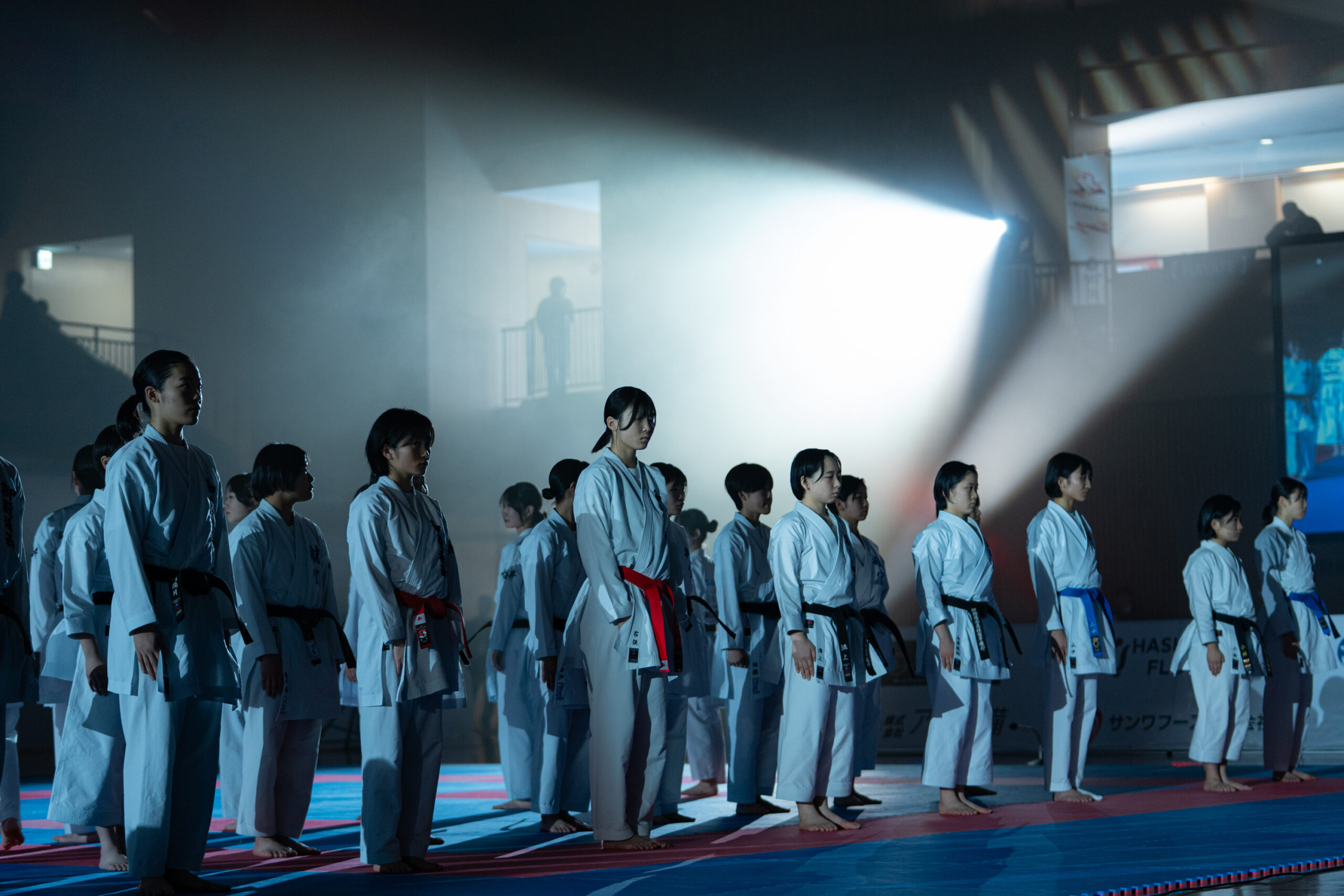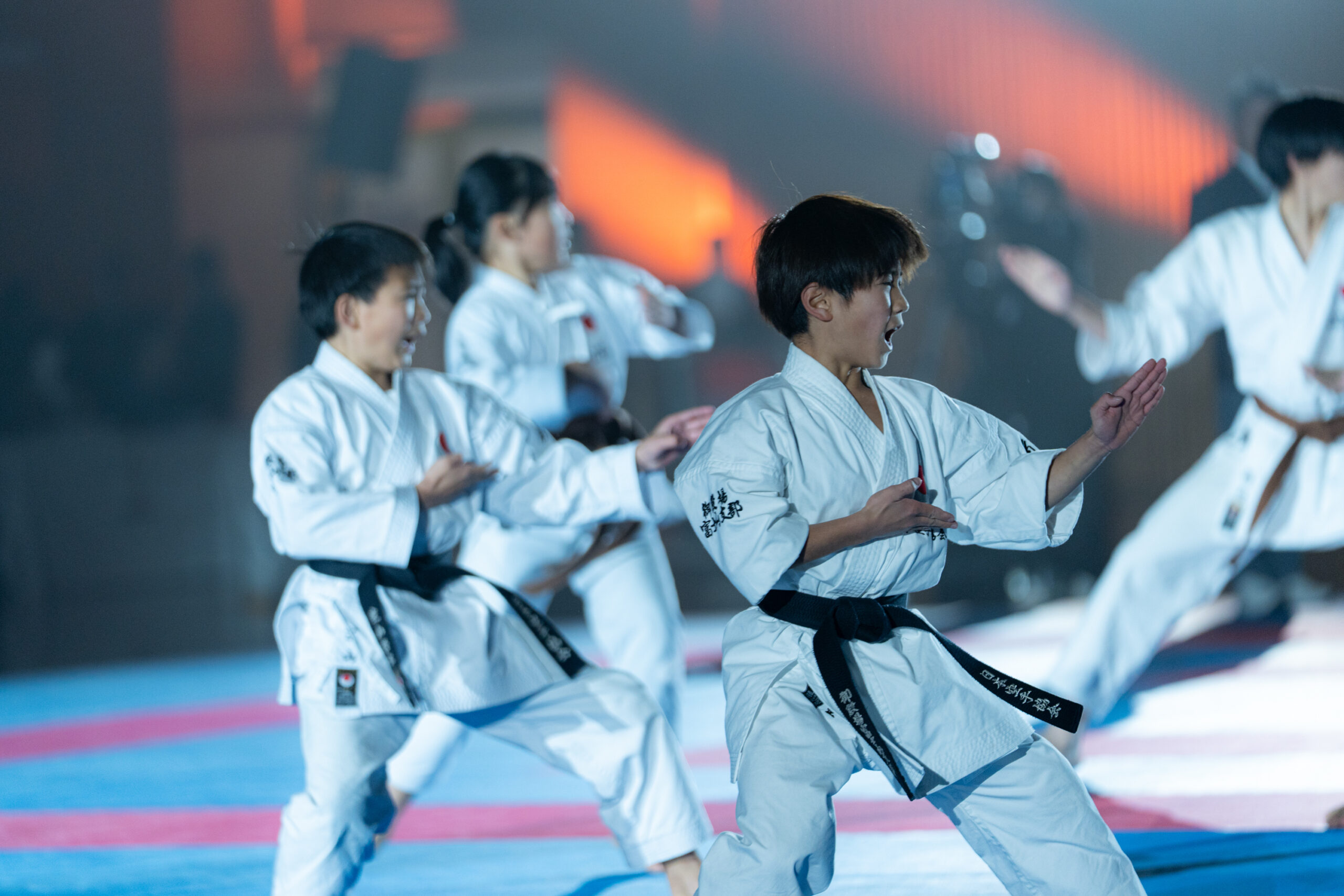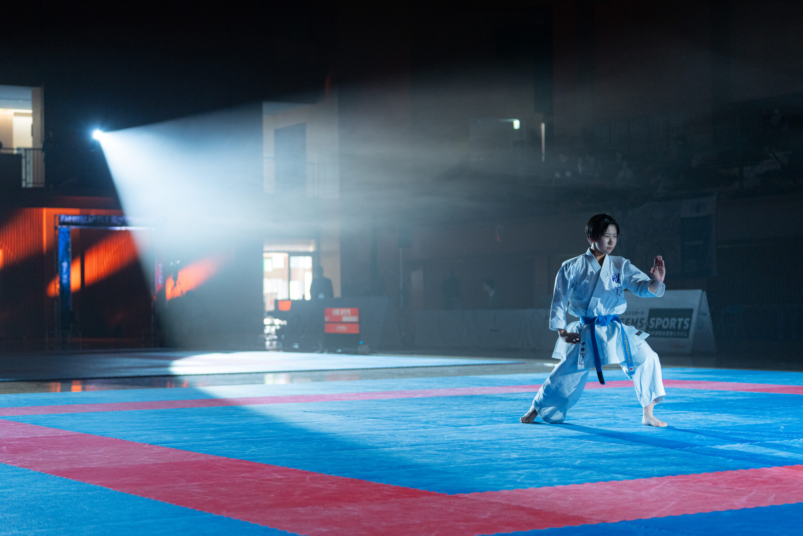 暗転した競技場をスポットライトが照らし、BGMに合わせて選手が入場。観客席からの拍手と歓声が重なり、試合前の緊張感は最高潮に。形の演武では、暗闇に浮かぶ選手の姿がより際立ち、美しさと迫力の両立した表現に観客が引き込まれました。