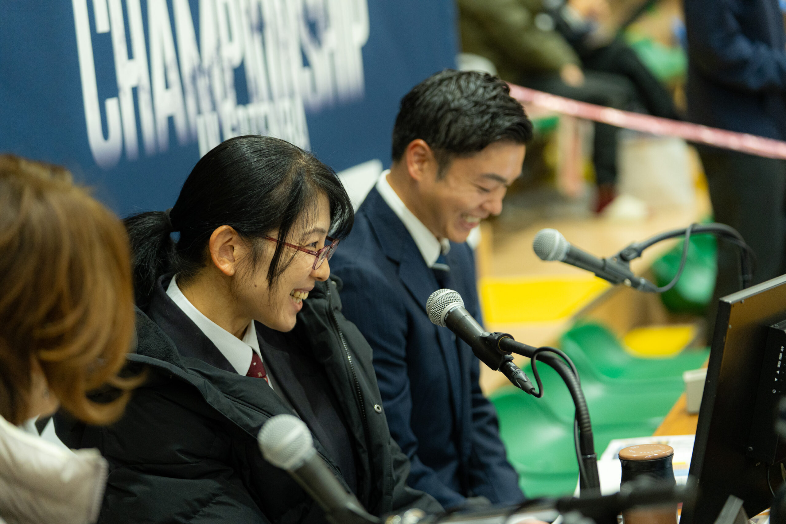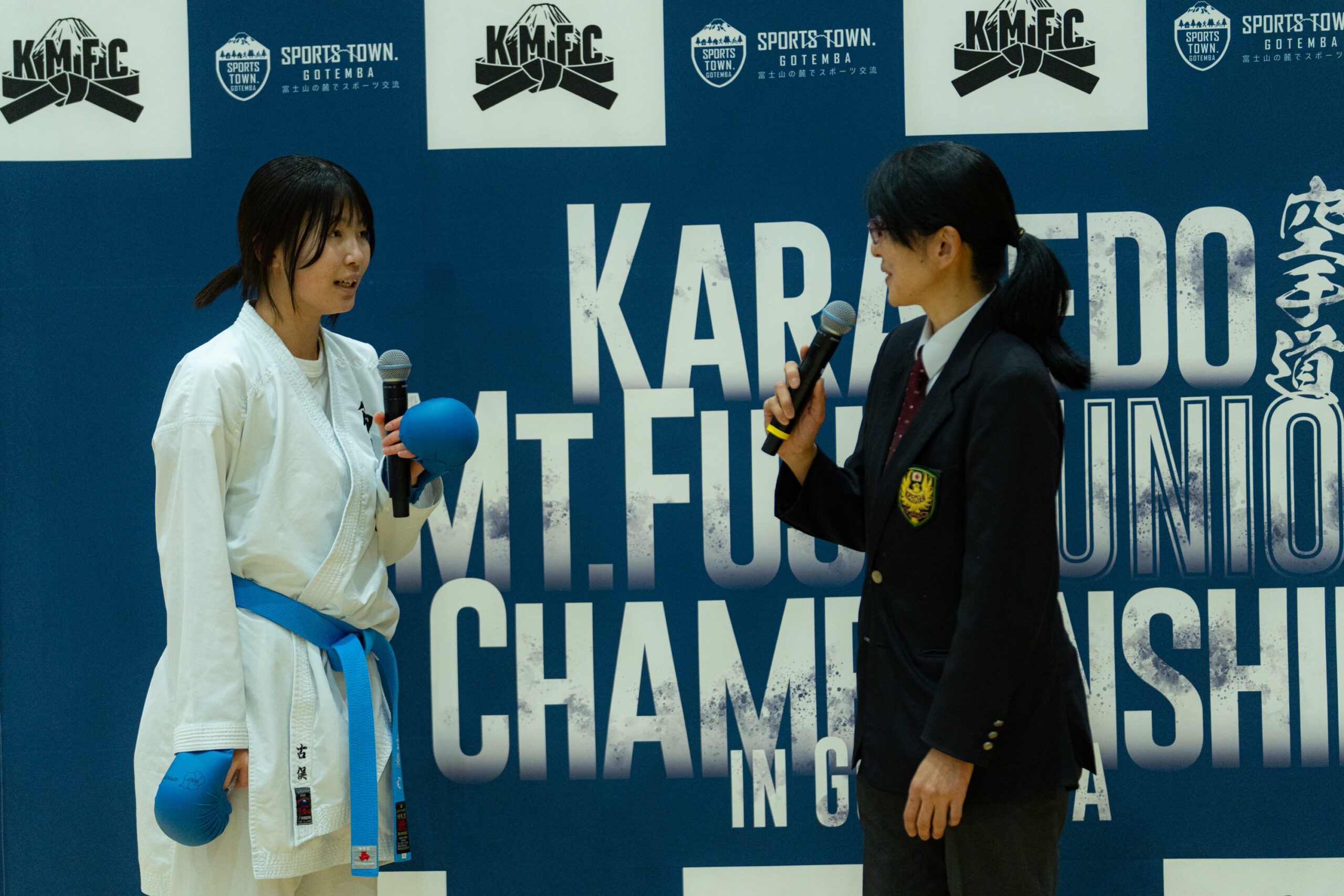 今年はKMFCで初めて優勝者インタビューを実施。インタビュアーは解説も務めた小島万記様と佐合尚人様に務めていただきました。憧れの人たちからのインタビューに選手たちは緊張しながらも、笑顔で次の目標や家族への感謝を語り、会場は大いに盛り上がりました。