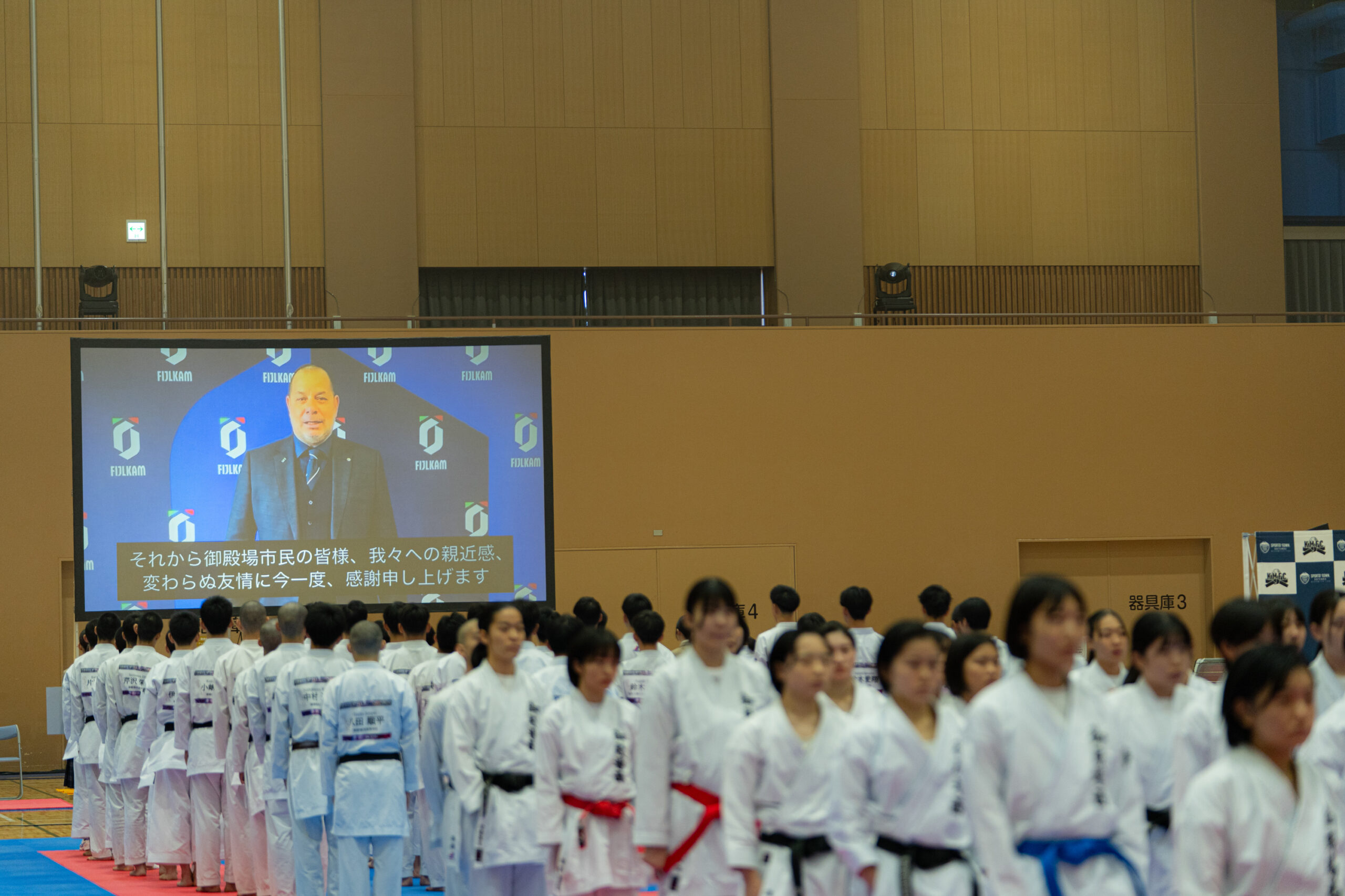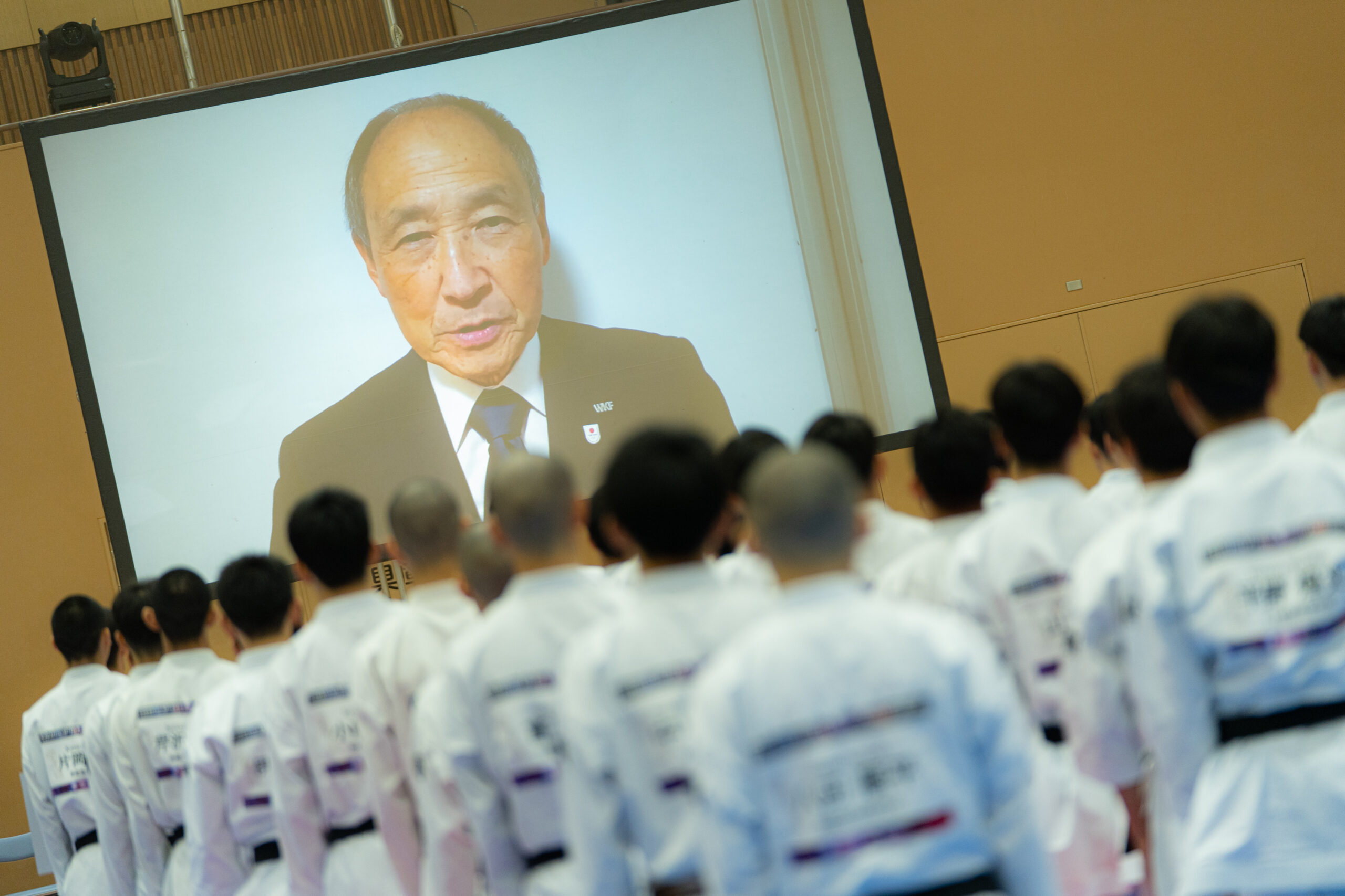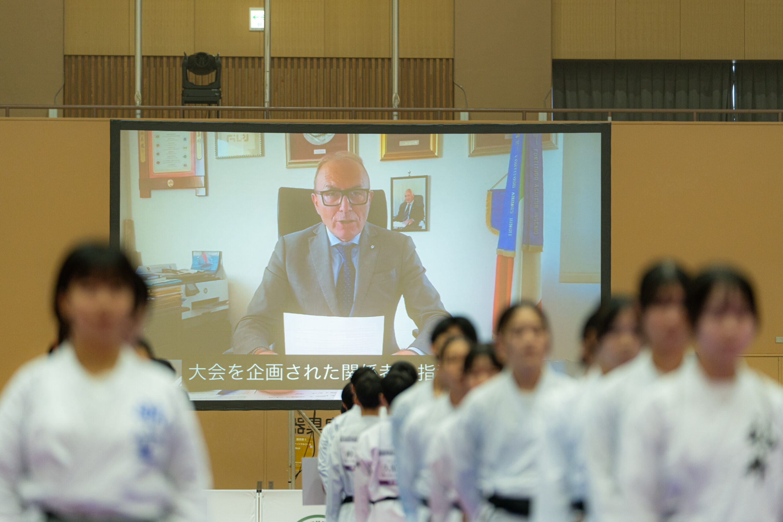 過去大会に引き続き、世界空手連盟様、全日本空手道連盟様、静岡県空手道連盟様、全国高等学校体育連盟空手道専門部様、静岡県からご後援をいただきました。開会式では全日本空手道連盟名誉会長の笹川堯(ささがわ たかし)様から祝辞を、世界空手連盟事務総長の奈藏稔久(なぐら としひさ)様とイタリア総合格闘技連盟会長のジョヴァンニ・モルシアーニ様、同じくイタリア総合格闘技連盟空手部門会長のダヴィデ・ベネテッロ様から大会開催にあたりお祝いのビデオメッセージをいただきました。