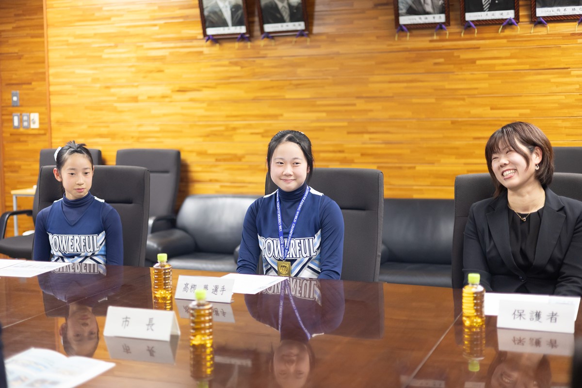 昨年12月、群馬県高崎アリーナで行われた第12回チアリーディング世界選手権大会において、JUNIOR2(12~15歳)の部で優勝を収めた髙栁夢選手と、同部エキシビションで奨励賞を受賞した髙栁萌選手が市長を表敬訪問しました。