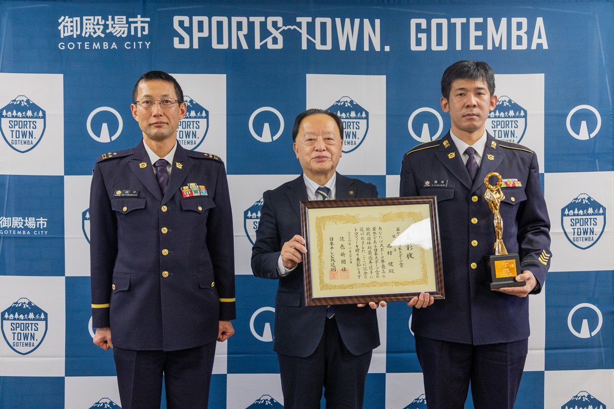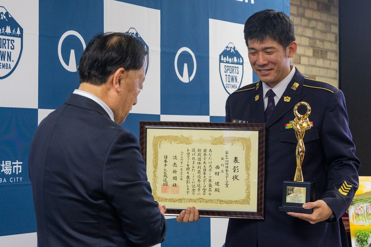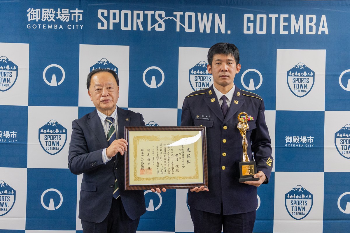 滝ケ原駐屯地はスポーツタウン御殿場の先頭に立って引っ張っていってくれる存在です。また、受賞者を見ると錚々たる面々が名を連ねており、その中に西村選手の名前があることは、市民の誇りであります。これからも頑張ってください。