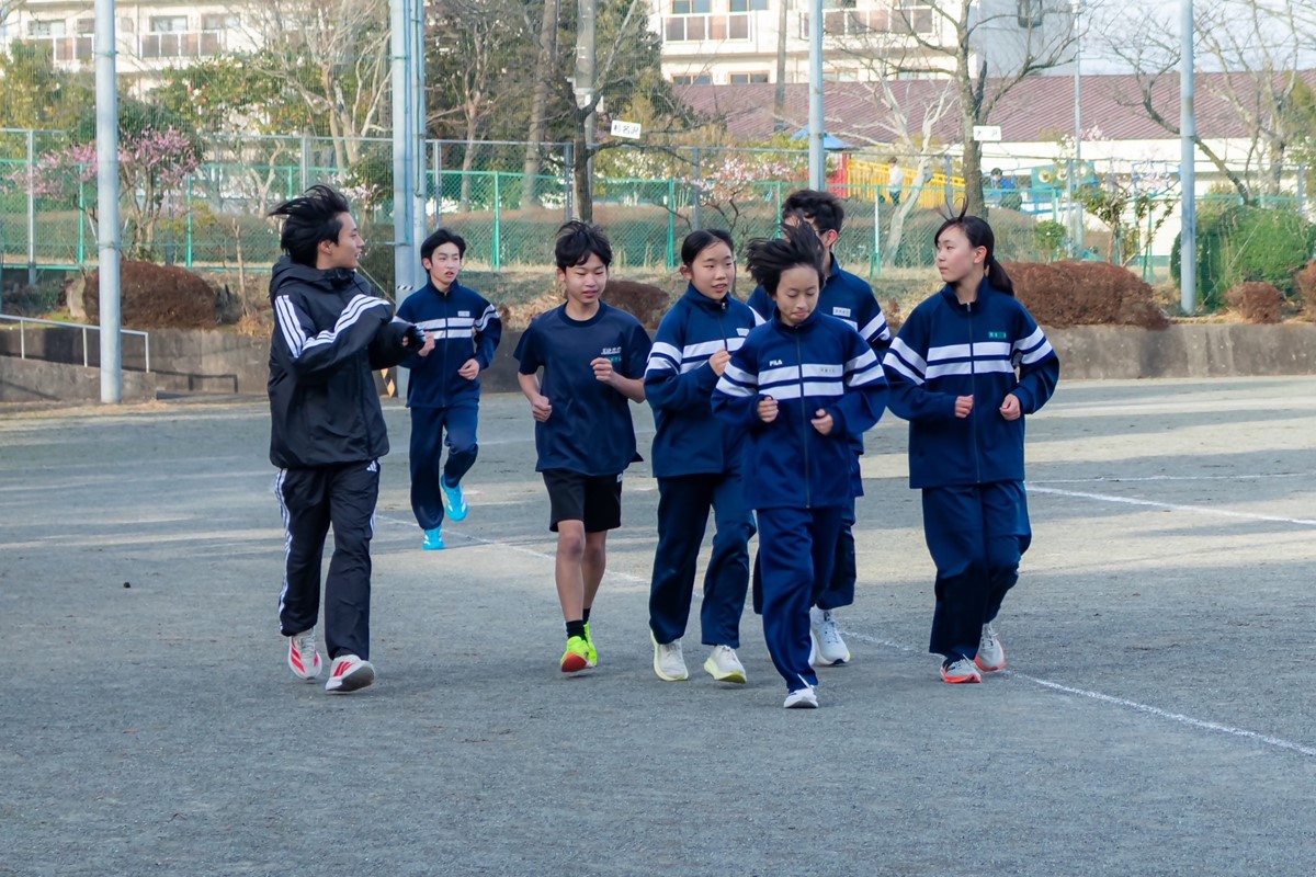 放課後には、陸上部への技術指導が行われました。はじめは緊張していた生徒たちも。吉田選手と一緒に練習をしていくうちに緊張がほぐれ、最後には楽しそうに一緒にランニングをする姿が見られました。